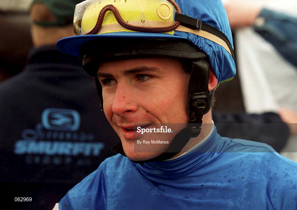 Michael Kinnane standing, dressed in colours (red jacket with white sash and white cap) and looking rather perplexed. Race goers and jockey in background.