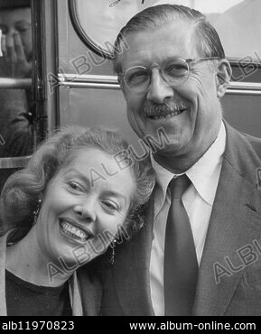 RM 2Y7FMXA–Armand and Michaela Denis meet a giraffe at Whipsnade Zoo.The couple were popular TV stars of the 1950s and 1960s with their series including Filming ...