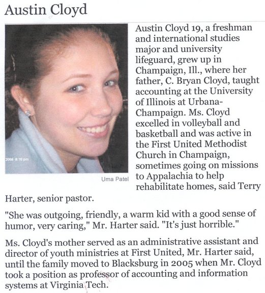 Austin Michelle Cloyd, age 18, of Blacksburg, Va., died Monday, April 16, 2007, on the Virginia Tech University campus in Blacksburg.