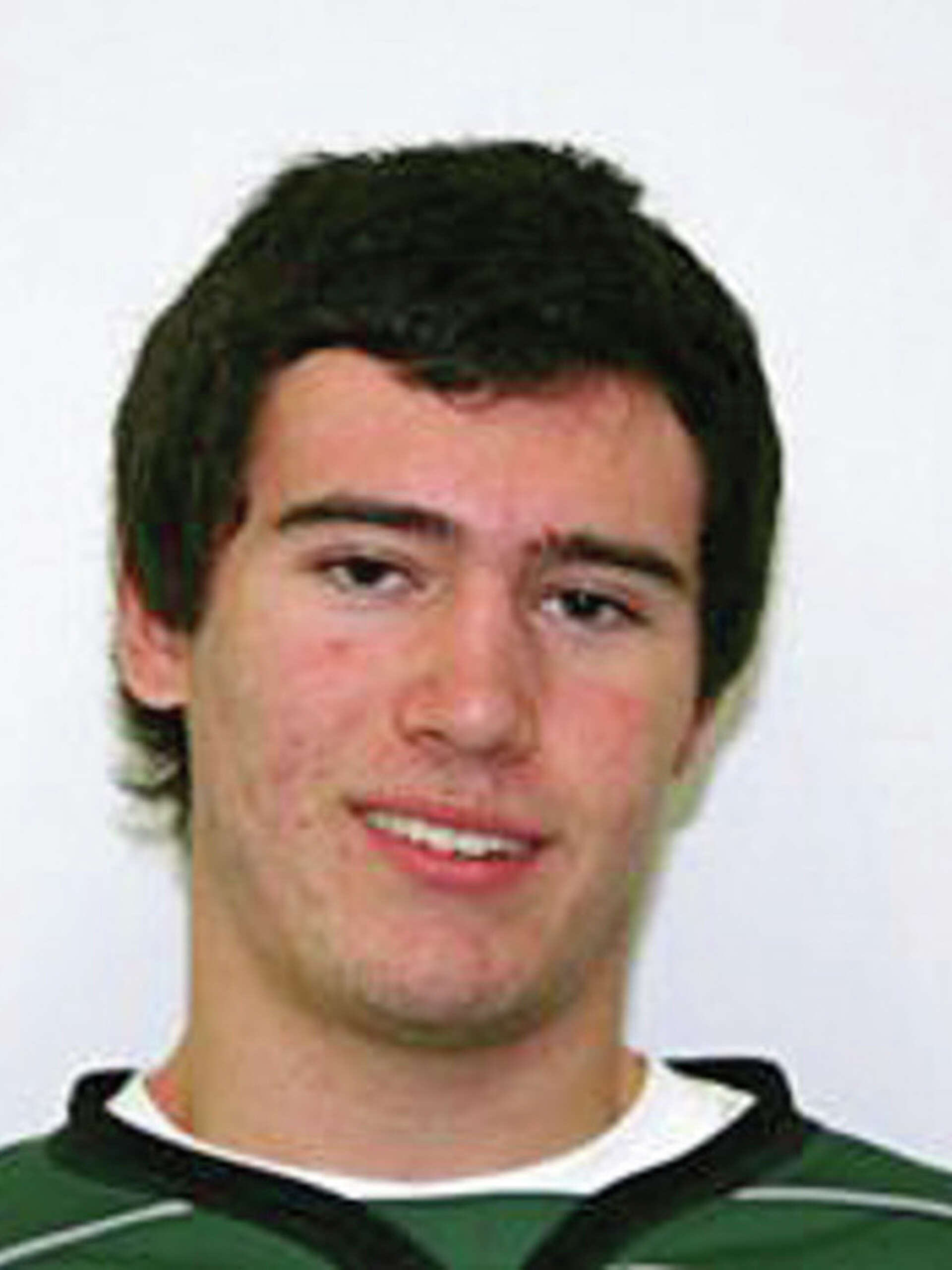 Portrait of Mike Backman of Saint Mary's University men's hockey team. He is in the arena and wearing hockey gear. Came in envelope marked 'Sports Hockey Team'.