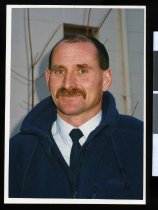 Mike Sternberg, retired Timaru Stevedoring manger, posed leaning against a wharf pole at Timaru, dated 19 February 1991. Photographer, Clarke, Simon, ...