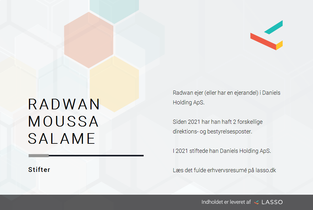 Erhvervsresume Radwan Moussa Salame er registreret med sin første erhvervsrolle i et anpartsselskab i 2021, hvor han i juli stiftede firmaet Daniels Holding ...