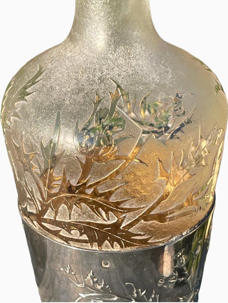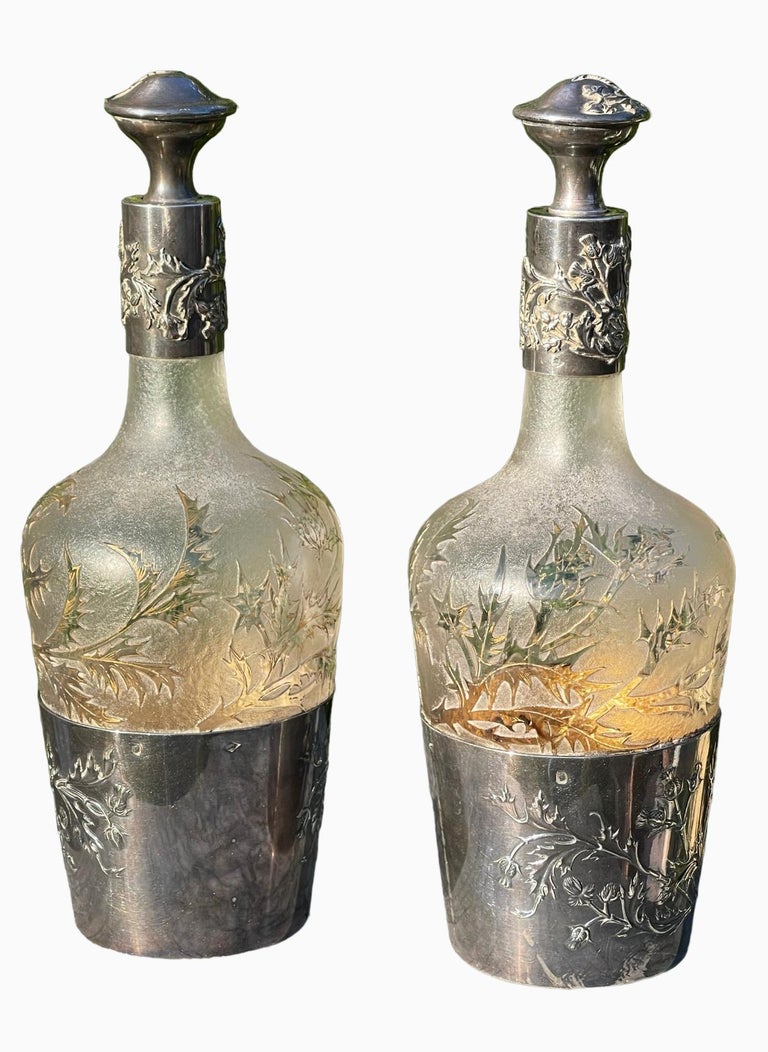 Lovely pair of silver decanters (neck brace hallmark) and crystal. These objects can. Art Nouveau Daum Nancy, Pair of Silver & Crystal Carafes For Sale.