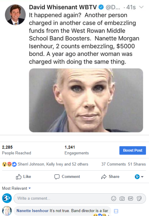 48-year-old Nanette Morgan Isenhour of Cooleemee is charged with two counts of embezzlement of funds by a public officer/trustee.