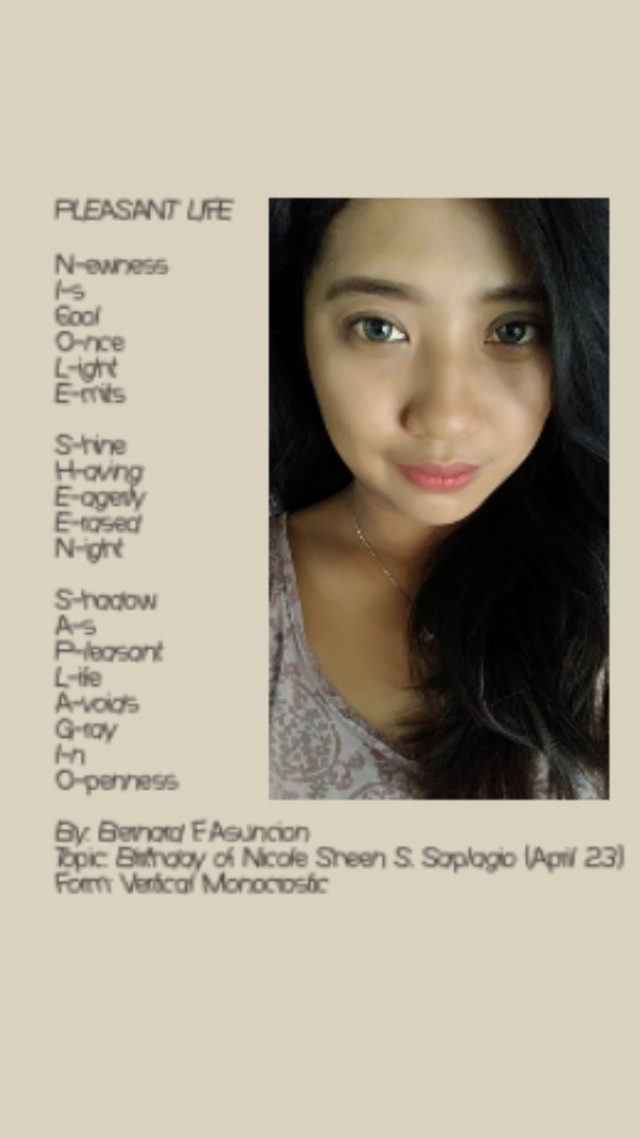 Topic: Birthday of Nicole Sheen S. Saplagio (April 23) Form: Vertical Monocrostic. Pleasant Life. Bernard F. Asuncion. Friday, July 27, 2018.