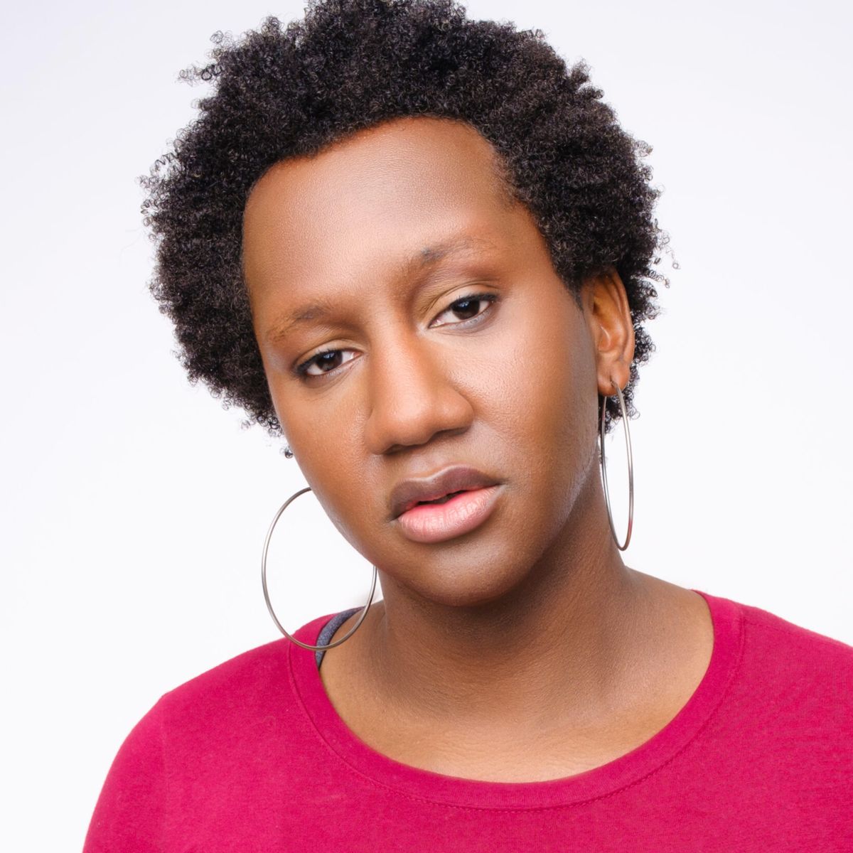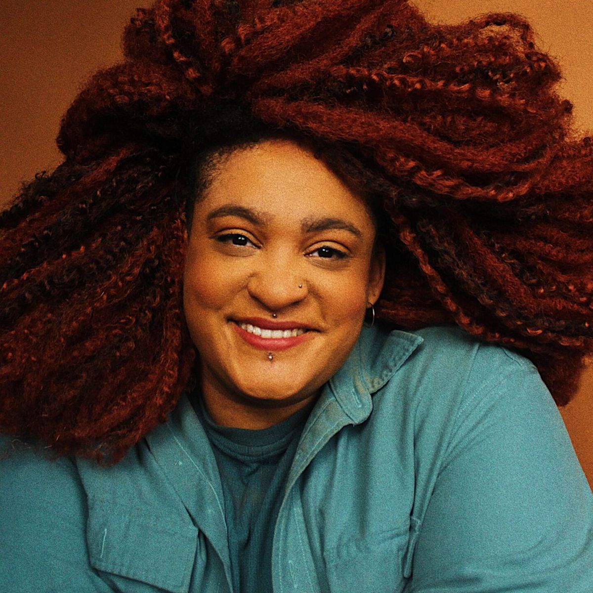 Nora Schell, with their curly brown hair in a stylish undercut, smiles softly at the camera. They wear a floral top with sheer fabric, small hoop earrings.