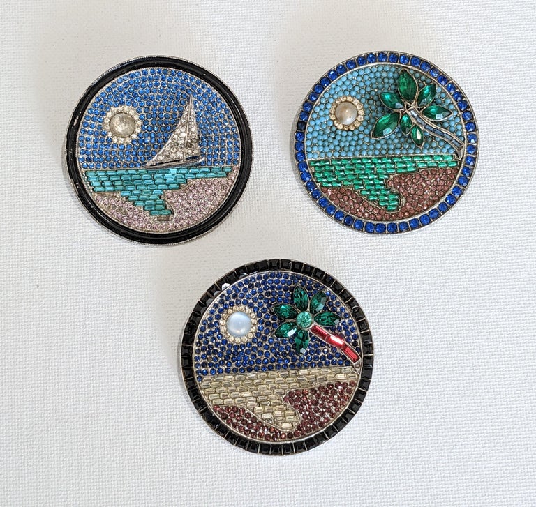 Vintage Unsigned ORA Moon Over Miami Pin Brooch. Circa 1930's. The piece measures 2 1/8 inches in diameter. Slightly concave in shape featuring small blue ...