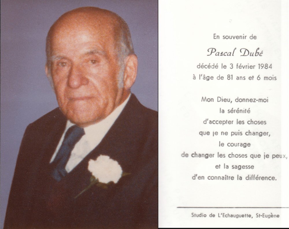 Pascal Dube, son of Jean Baptiste Dube and Marie Anne Roy Dit Desjardins. Born 1807, died Jun 30, 1885, 77 or 78 years.