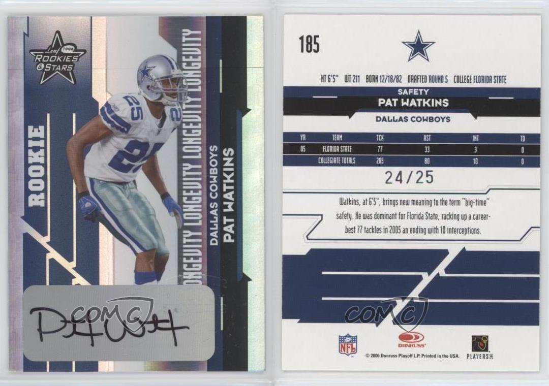 Pat Watkins. School: Florida State. Position: DB. Draft: 5th round, 138th overall of the 2006 NFL draft by the Dallas Cowboys.