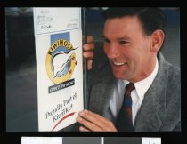 Peter Shutt posed with his book on fishing in the South Island, circa 1985. The book was first published in 1983, but revised and reprinted each year until 1990 ...