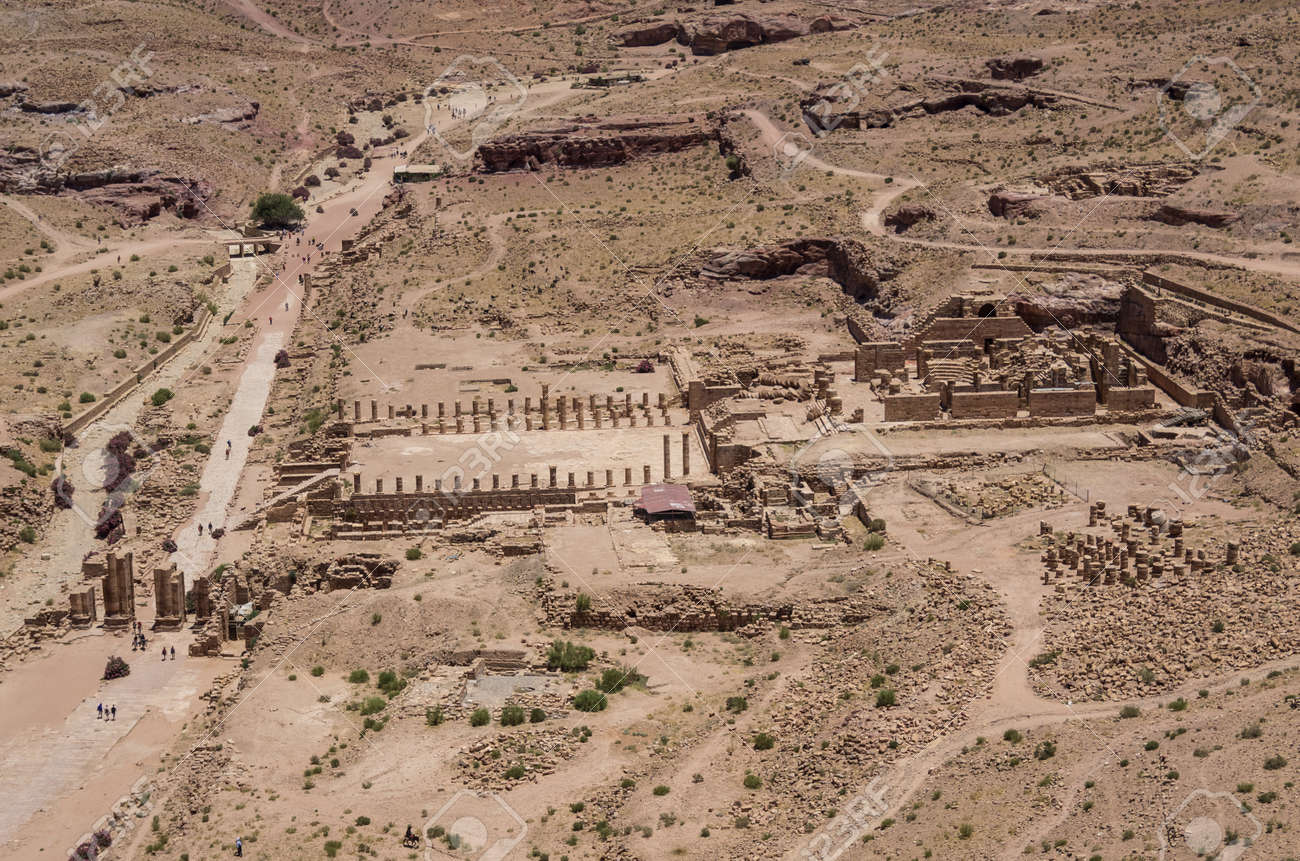Petra bird's eye view : Wadi Musa, Jordan. Tourists walking around the facades of Petra, Jordan. March the 5th 2018. Birdwatching in Petra - Jordan ...