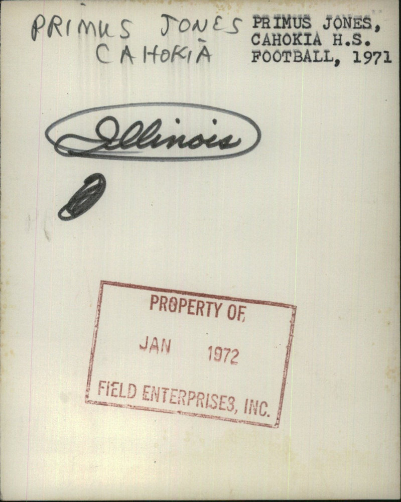 Photo measures 4 x 5 inches. Photo is dated 01/01/1972. Primus Jones is Cahokia high school football player.