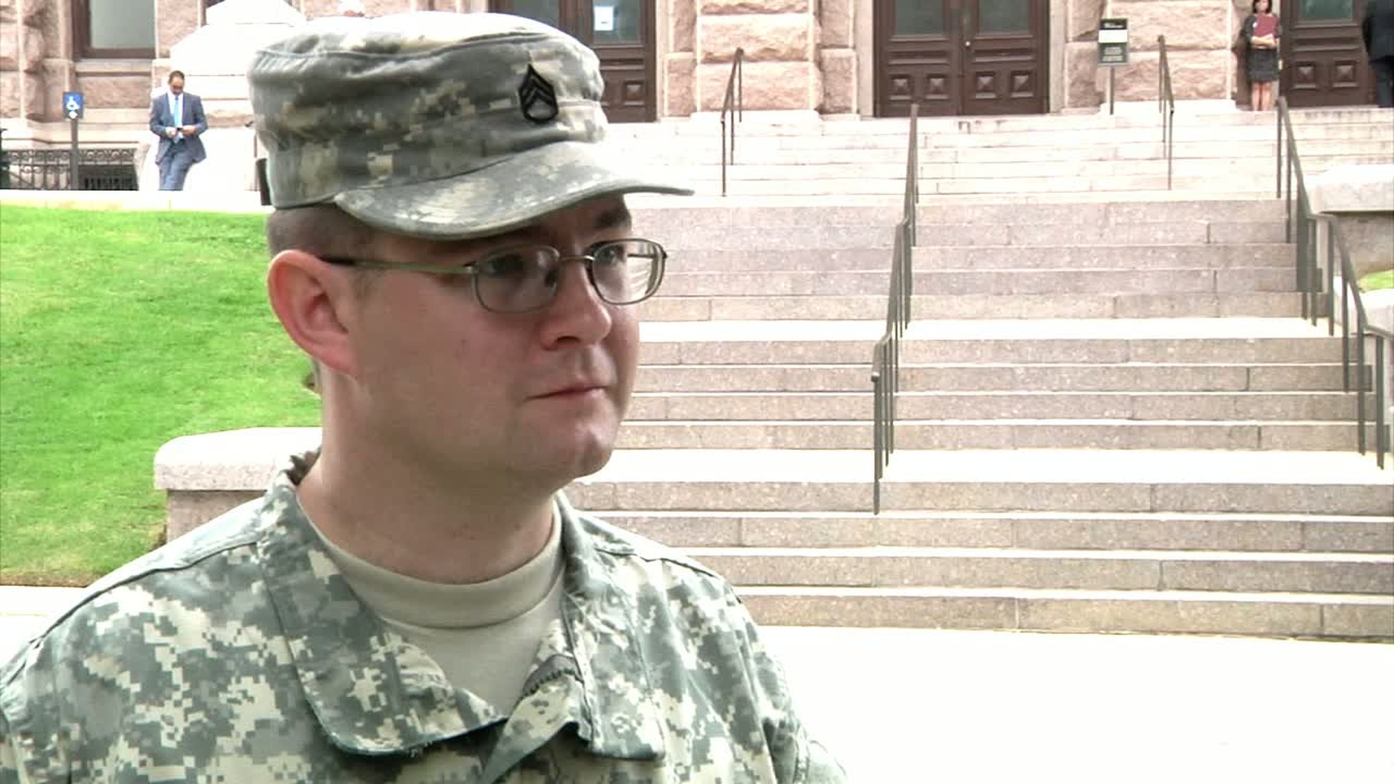 Robert Bobst, Kansas City, Kan., talks to a military reporter about the Battle Streamers Re-dedication Ceremony at Camp Pendleton.