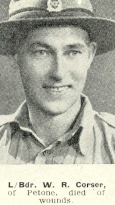 Lance Bombardier WILLIAM ROBERT CORSER. Service Number: 60441. Regiment & Unit/Ship. New Zealand Artillery. 4 Field Regt. Date of Death. Died 08 August 1944.