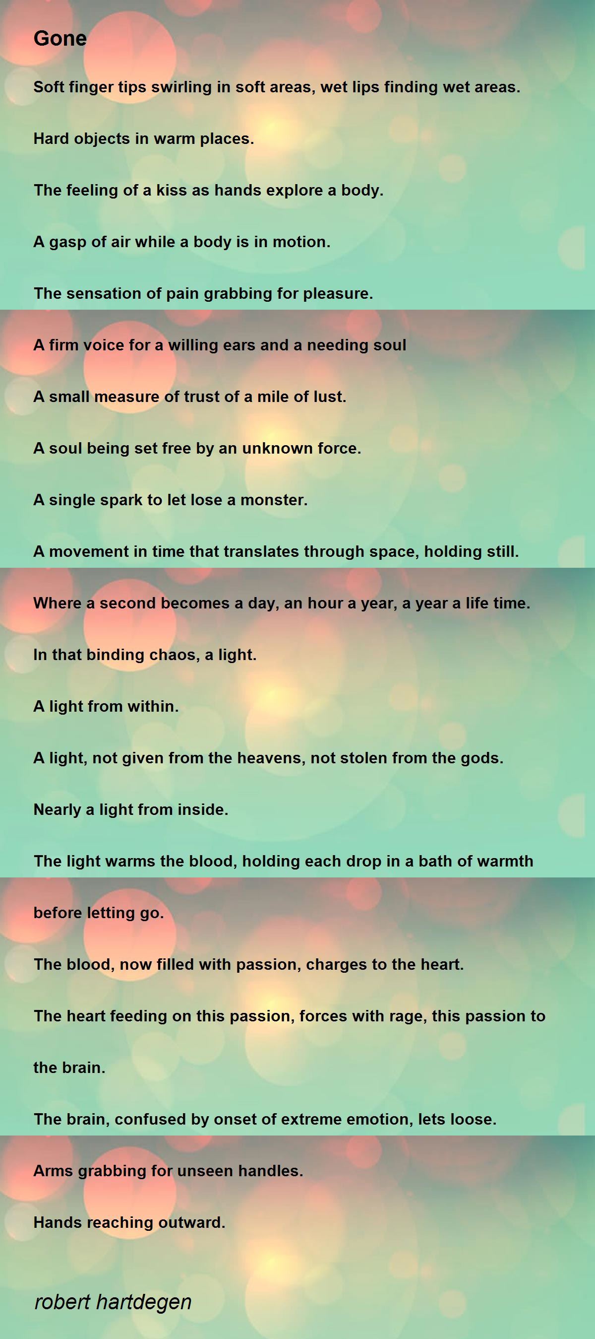The Best Poem Of robert hartdegen. Gone Soft finger tips swirling in soft areas, wet lips finding wet areas. Hard objects in warm places.