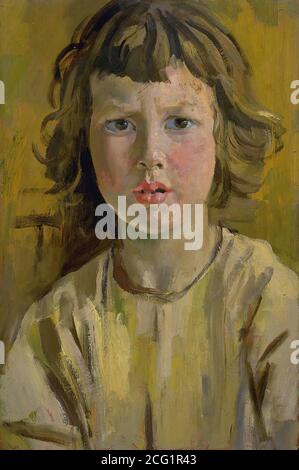 Robin was the third son of Augustus John and his wife Ida; he was eight when this portrait was painted. John often used his family as models, particularly for his less conventional work. In this intimate study, the boyโs long tousled hair suggests both freedom and ambiguity of gender. The close-up perspective also disturbs the boundaries of ...