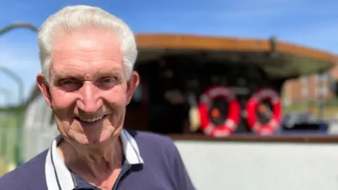 A smiling Rodney Bowles stands at the rear of the Boston Belle pleasure cruiser. He has swept-back, white hair and wears a blue shirt with white collar.