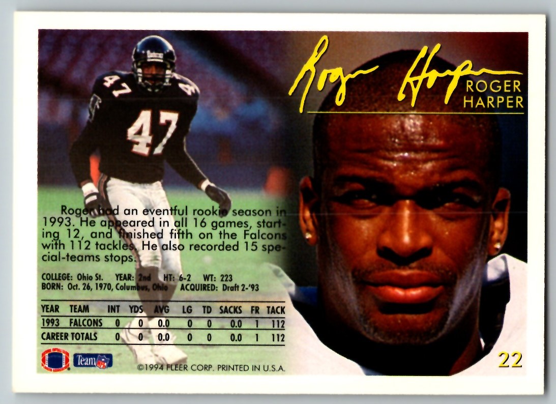 Roger Harper. Roger Michael Harper. Position: DB. 6-2, 225lb (188cm, 102kg). Born: October 26, 1970 in Columbus, OH. College: Ohio St. (College Stats).