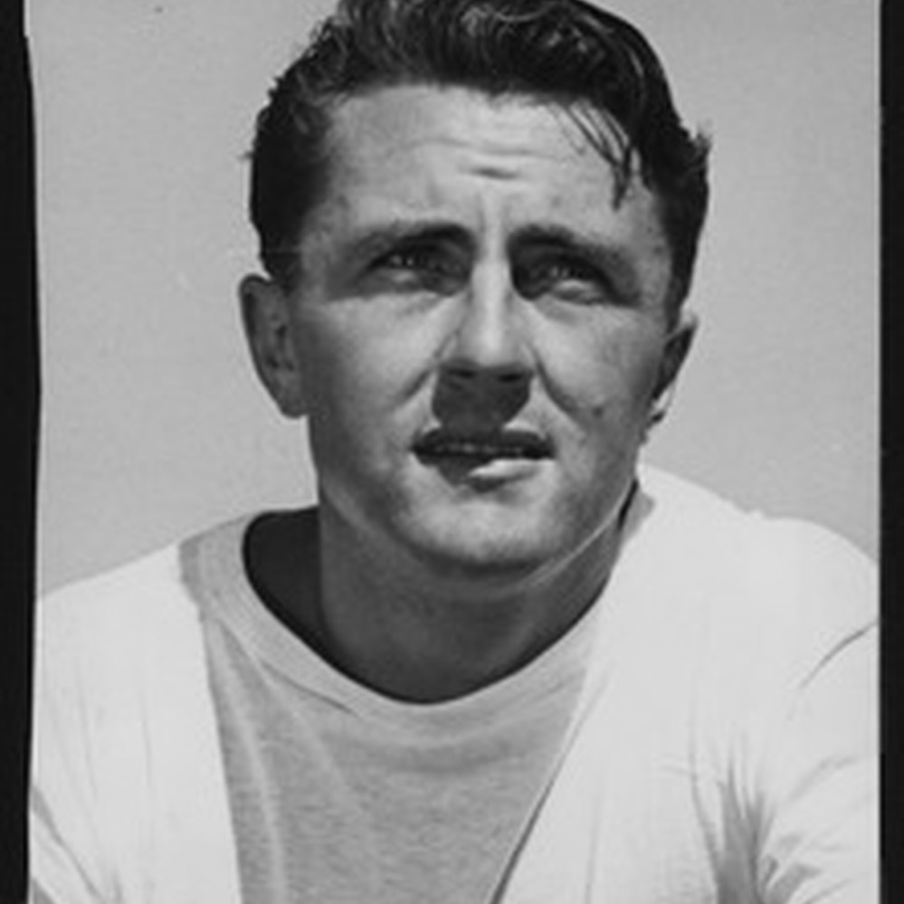 Photograph of University of Southern California assistant football coach Roy Engle on Bovard Field, wearing a white t-shirt. Taken in 1946. Type: image