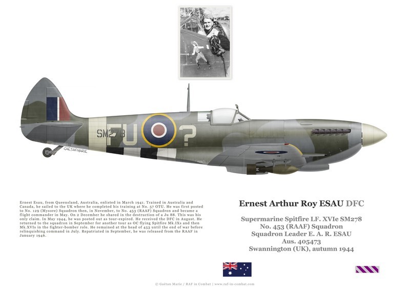 Text: Ernest Arthur Roy ESAU DFC Supermarine Spitfire LF. XVIe SM278 No. 453 (RAAF) Squadron Squadron Leader E. A. R. ESAU Aus. 405473