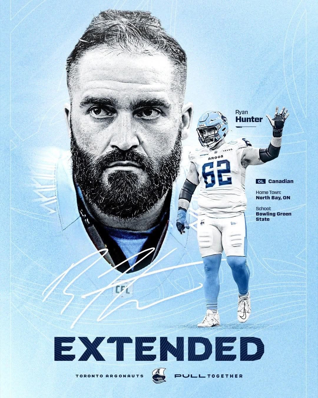 Ryan Hunter ; No. 62 – Toronto Argonauts ; Position: Offensive lineman ; Personal information ; Born: (1995-04-01) April 1, 1995 (age 29) North Bay, Ontario, Canada.
