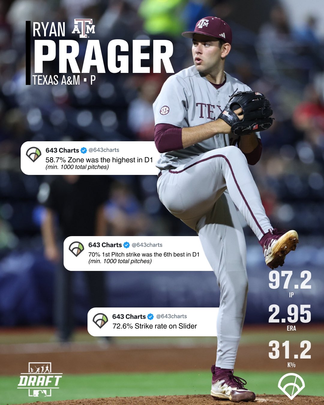 Ryan Prager ; Born: 10/26/2002 in Dallas, TX ; Draft: 2024, Los Angeles Angels, Round: 3, Overall Pick: 81 ; College: Texas A&M.