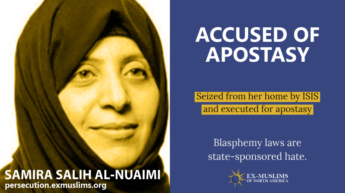 ISIS tortures, executes human rights activist and lawyer Samira al-Nuaimi accused of apostasy. A lawyer and human rights activist, Samira was critical of ...