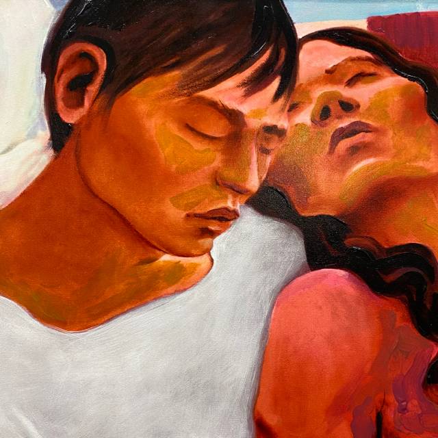 man & woman painting signed Sandra Bierman no frame 39" x 32" ht.