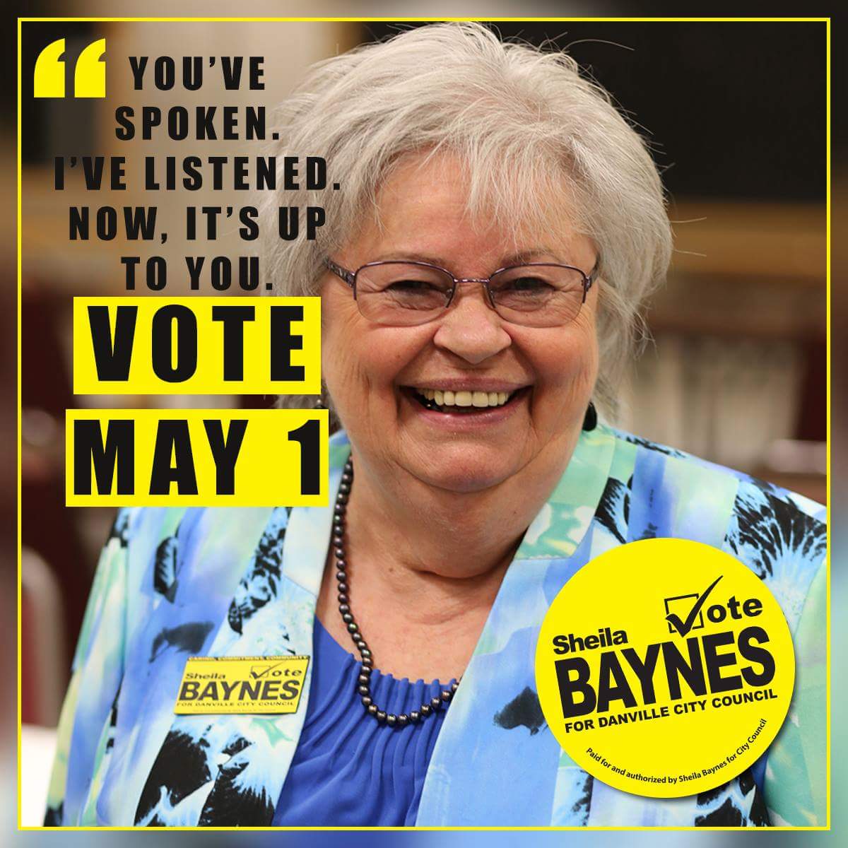 Vote Sheila Baynes on May 1! Paid for and authorized by Sheila Baynes for City Council.