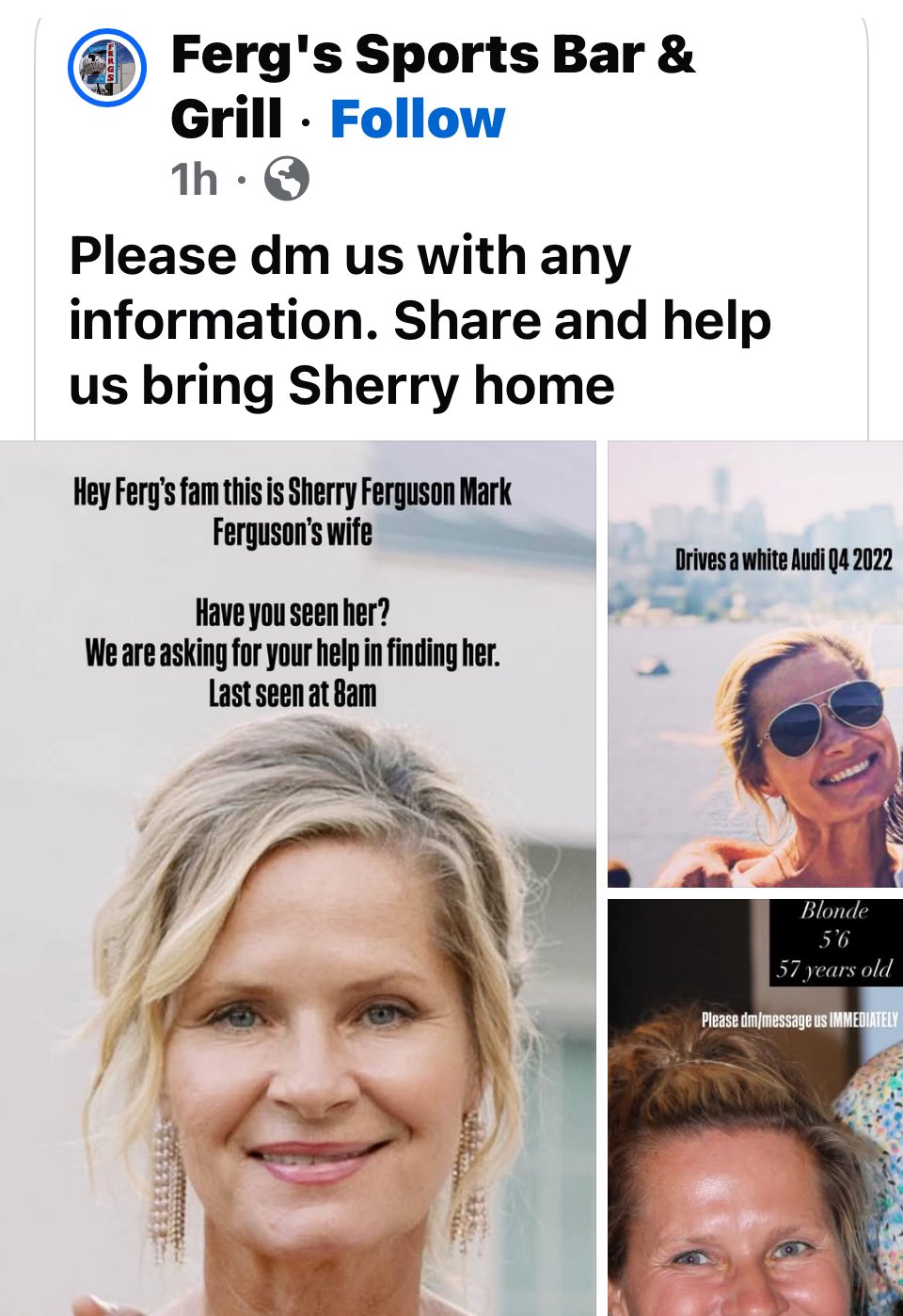 Ferg's owner, Sherry Ferguson is missing. Sorry, this post was deleted by the person who originally posted it. Share Share. citiusaltius.