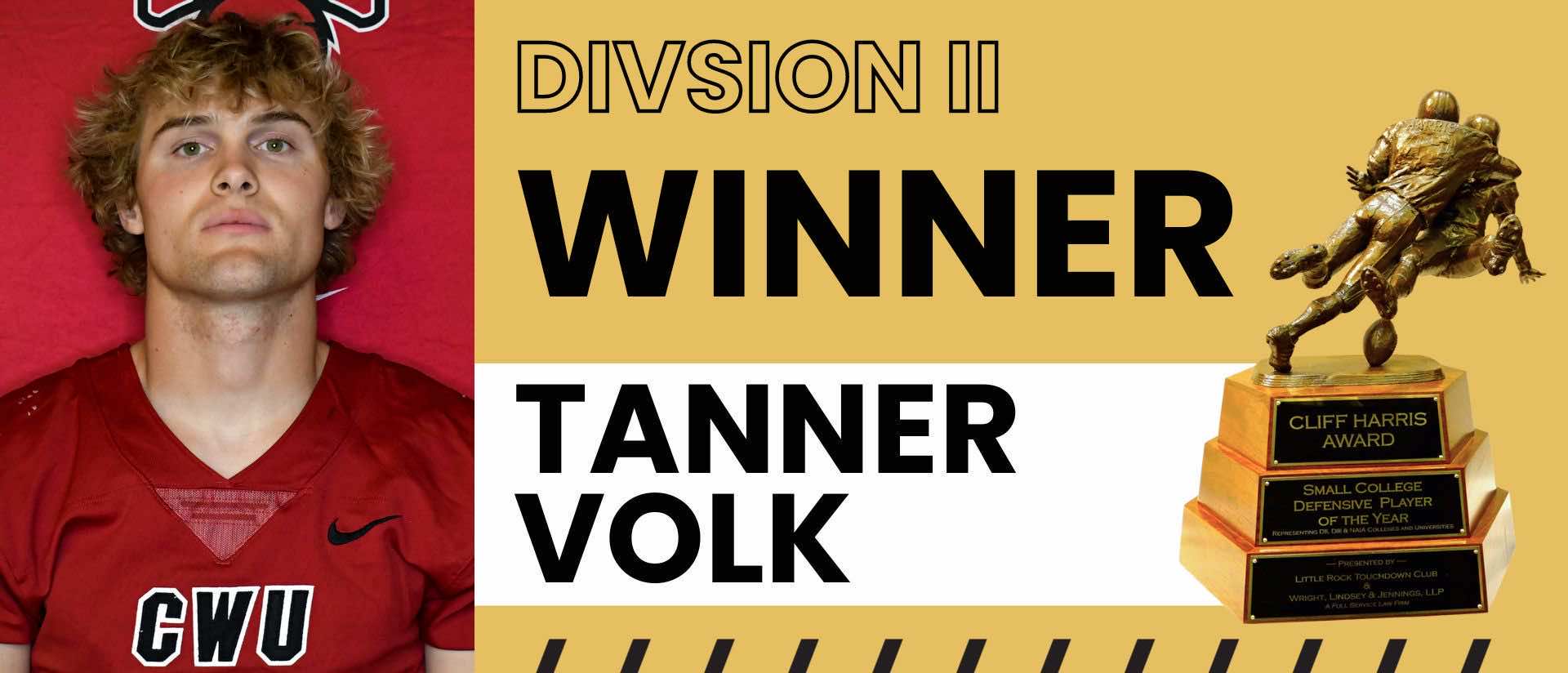 Central Washington safety Tanner Volk officially received the Cliff Harris Award this week in a celebration honoring all three award winners from NCAA Divisions II and II and NAIA.Volk was named the Division II winner on December 28, 2023.
