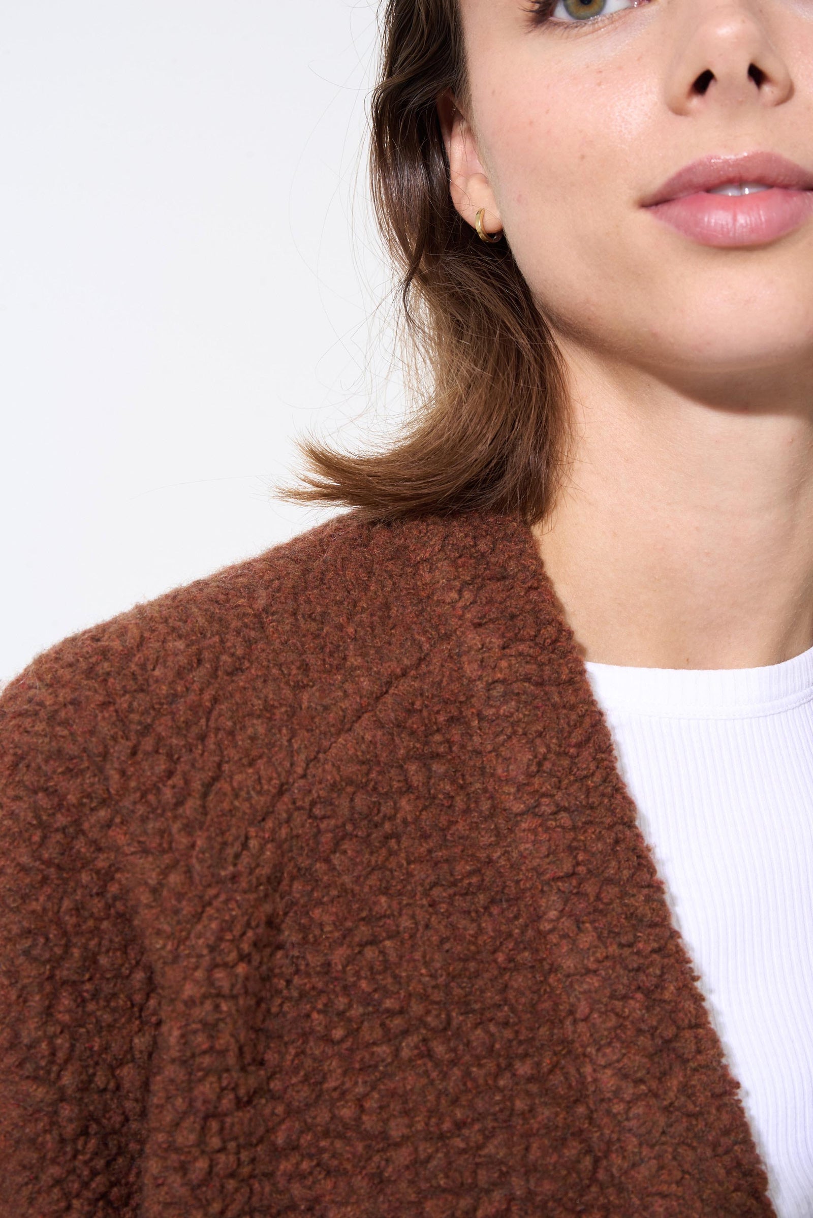 Ted vest is a straight, short vest with a deeper armhole and button plackets. It is knitted top down in bouclé yarn held together with one strand of wool yarn, ...