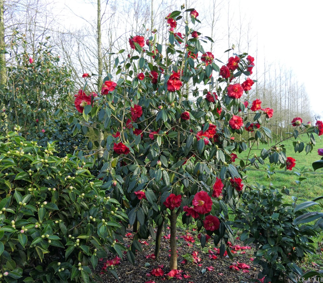 Camellia Terrell Weaver. Flame to dark red booms. Semi double to loose peony form. Mid season bloomer which grows to around 2 x 1.6m.