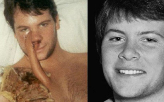 Cancer survivor, Terry Healey, sits shirtless in a hospital bed after facial surgery. Terry Healey after major cancer surgery in 1985. I ...