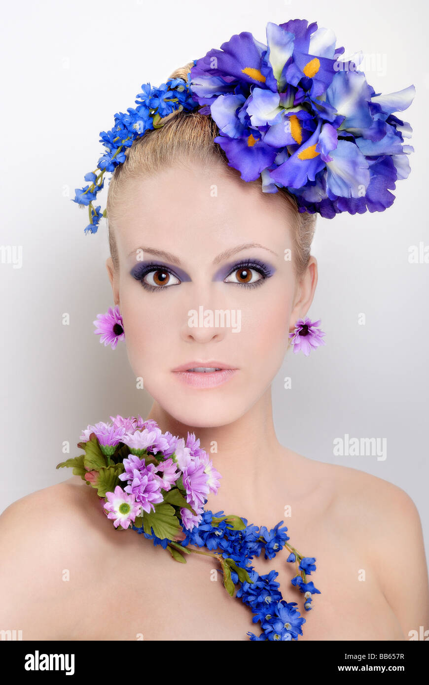 High-fashion model in an original Travis VanDenBerg image. Original haute couture makeup/hair/flower designs. Suitable for highest-quality publications.
