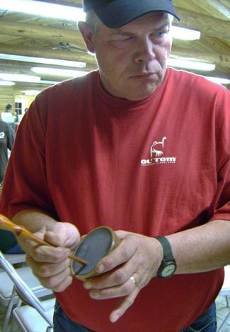 Troy Wheat, a three-time natural voice world champion caller, points to his protege, Jake Scrape, before they put on a calling performance of a morning turkey ...