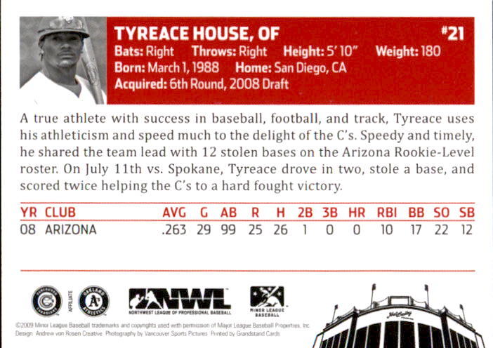 Tyreace House · Status: Active · Born: 3/01/1988 in Santa Clarita, CA · Draft: 2008, Oakland Athletics, Round: 6, Overall Pick: 184 · College: College of the ...