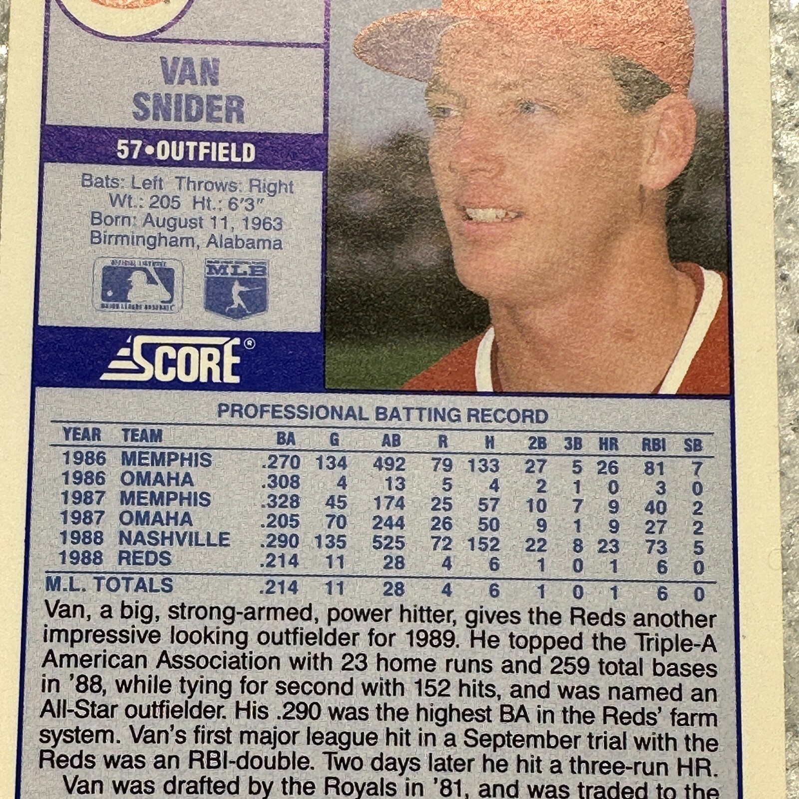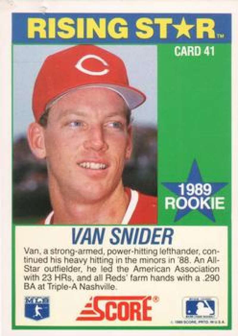 Outfielder Van Snider played for the Cincinnati Reds in 1988 and 1989. Snider was in the Kansas City Royals organization from 1982 to 1987, twice hitting 20+ home runs.