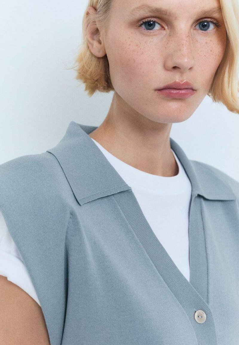 Vanessa Vest ... Sleeveless knitted vest with a V-neck and a soft texture. The vest features a relaxed fit, providing a modern and cozy look. The model is 176 cm ...