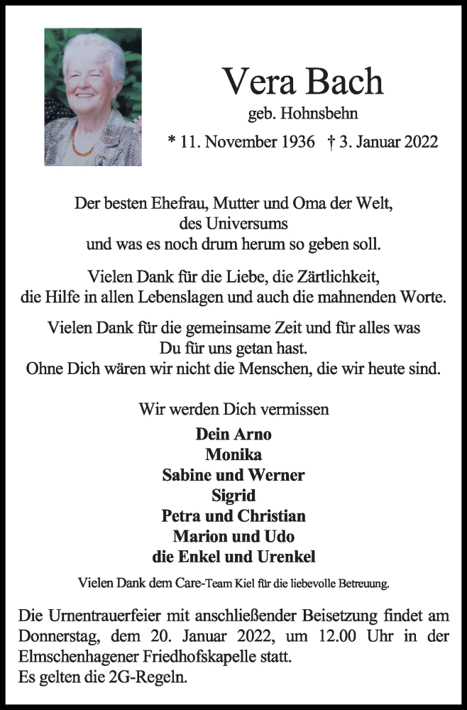 View The Obituary For Vera Bach. Please join us in Loving, Sharing and Memorializing Vera Bach on this permanent online memorial.