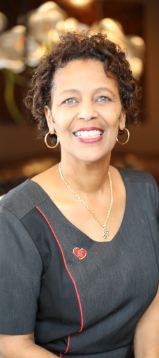 Photograph of Vera Reeves in front of a decorative backdrop. She is wearing a light colored top and is wearing a beaded necklace.