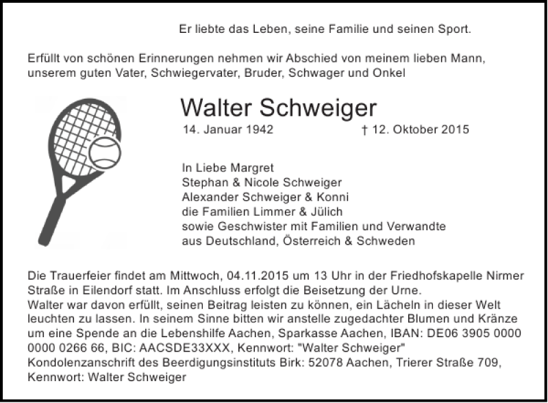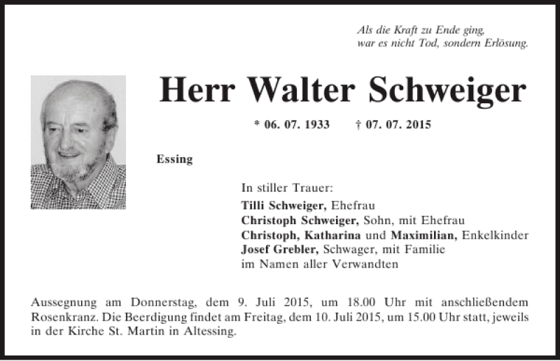 Walter Schweiger Obituary - Death Notice and Service Information