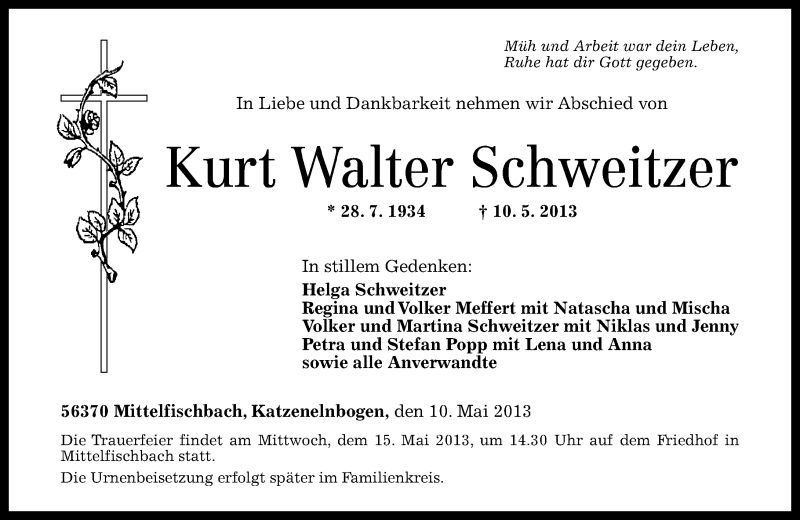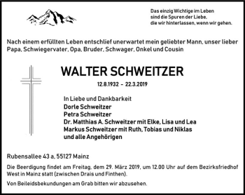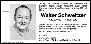 Obituary for Walter Schweitzer. Walter Albert Schweitzer was called home to be with our Lord and Saviour on April 9, 2010 at the age of 84 years. Walter was ...