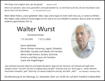Walter Wurst Obituary ... Wurst, Walter Saline, MI Walter Willie Wurst of Saline, MI passed peacefully on Wednesday, April 28, 2021, at age 78.