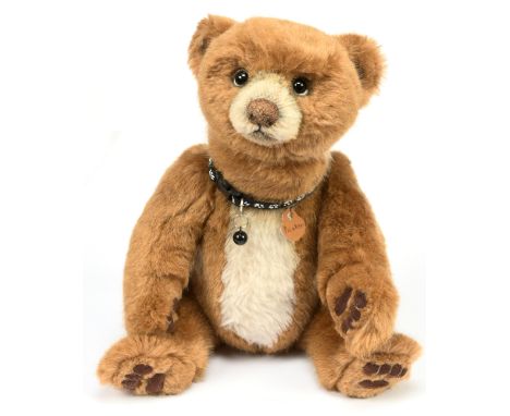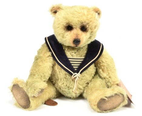A Wendy Boston teddy bear with golden mohair, amber and black plastic eyes, cut muzzle, black stitched nose and mouth, swivel head, jointed limbs and velvet ...