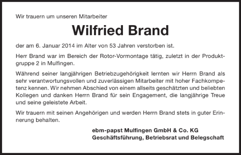 Besuchen Sie die Gedenkseite von Wilfried Brand. Lesen Sie die Traueranzeige und gedenken Sie dem Verstorbenen mit einer Kerze oder ...