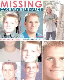 Zachary Bernhardt was 8 when he went missing in 2000. An aged-progressed photo (left) gives an idea of what he may look like now.